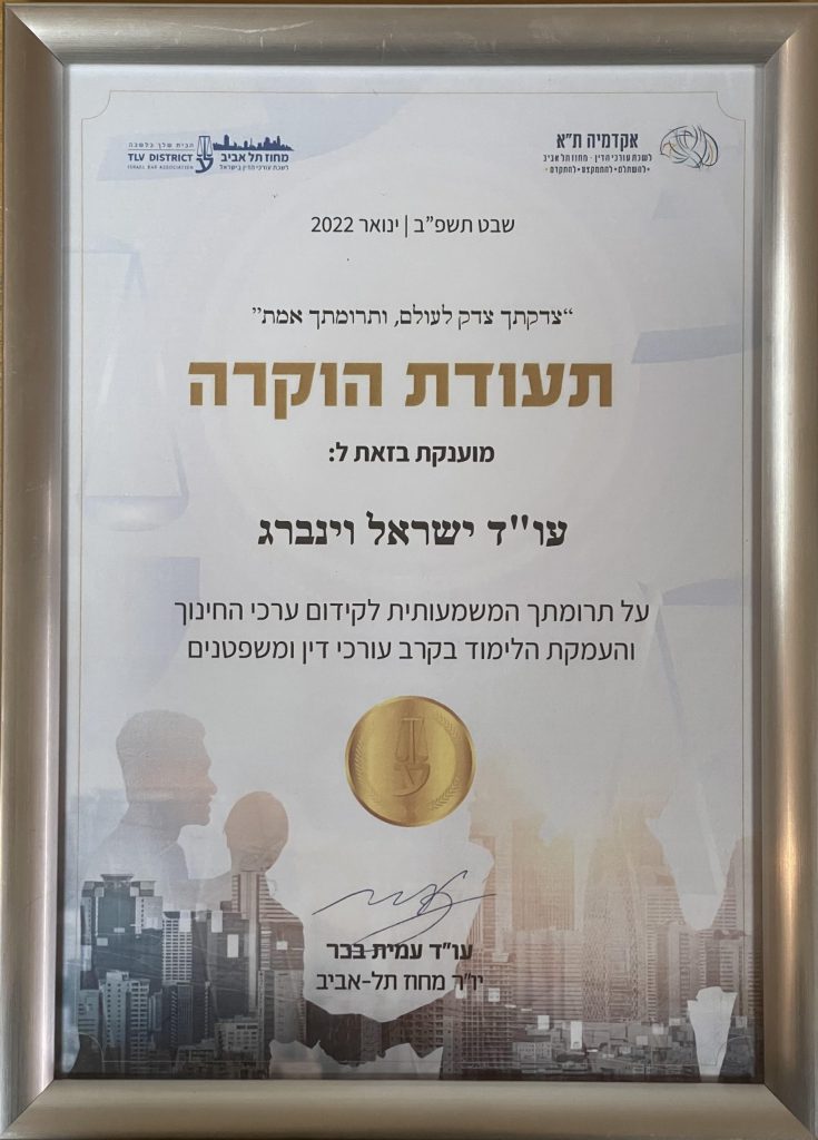 לעו״ד ישראל וינברג, תודה על שהשקעת מאמצים במקצועיות רבה ואפשרת לצדק להעשות. מעריכים את הליווי שלך בתקופה הקשה בחיינו. שימשת לנו מעבר לעו״ד בתקופה המורכבת של ההליך המשפטי. מבחינתנו אתה מורה רוחני לסבלנות ודרך ארץ.